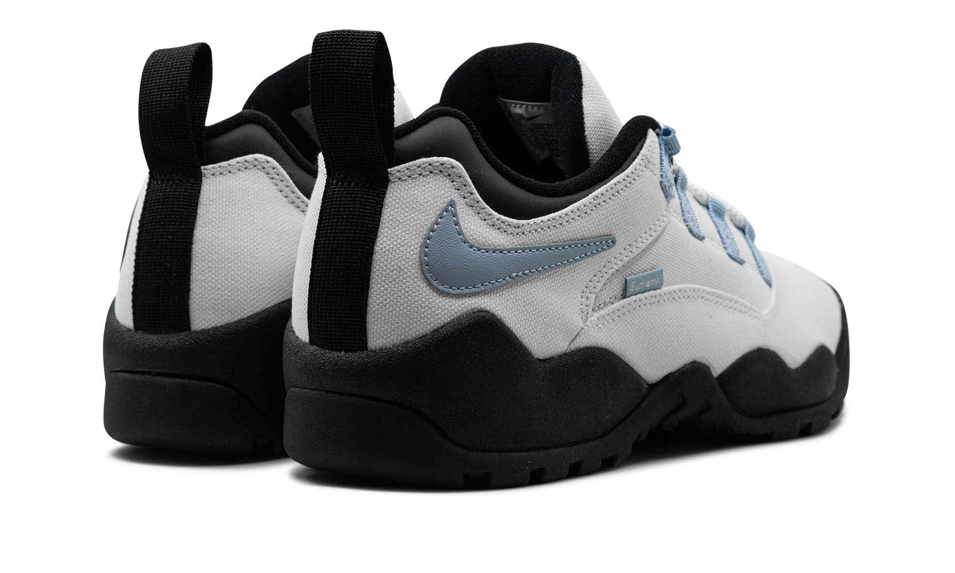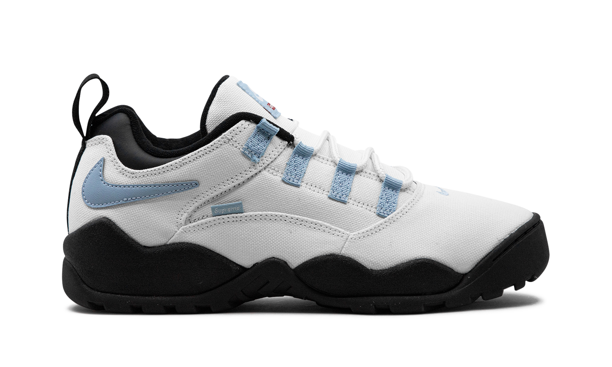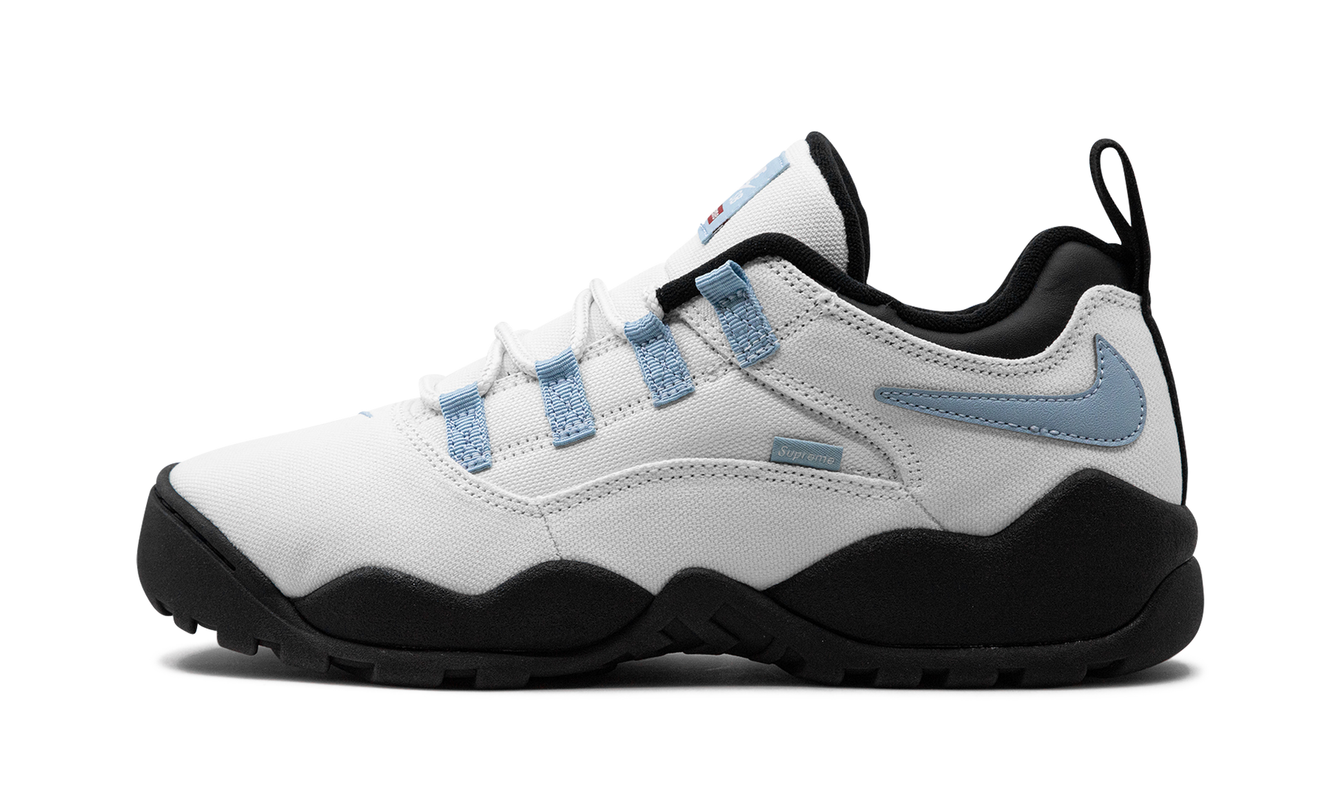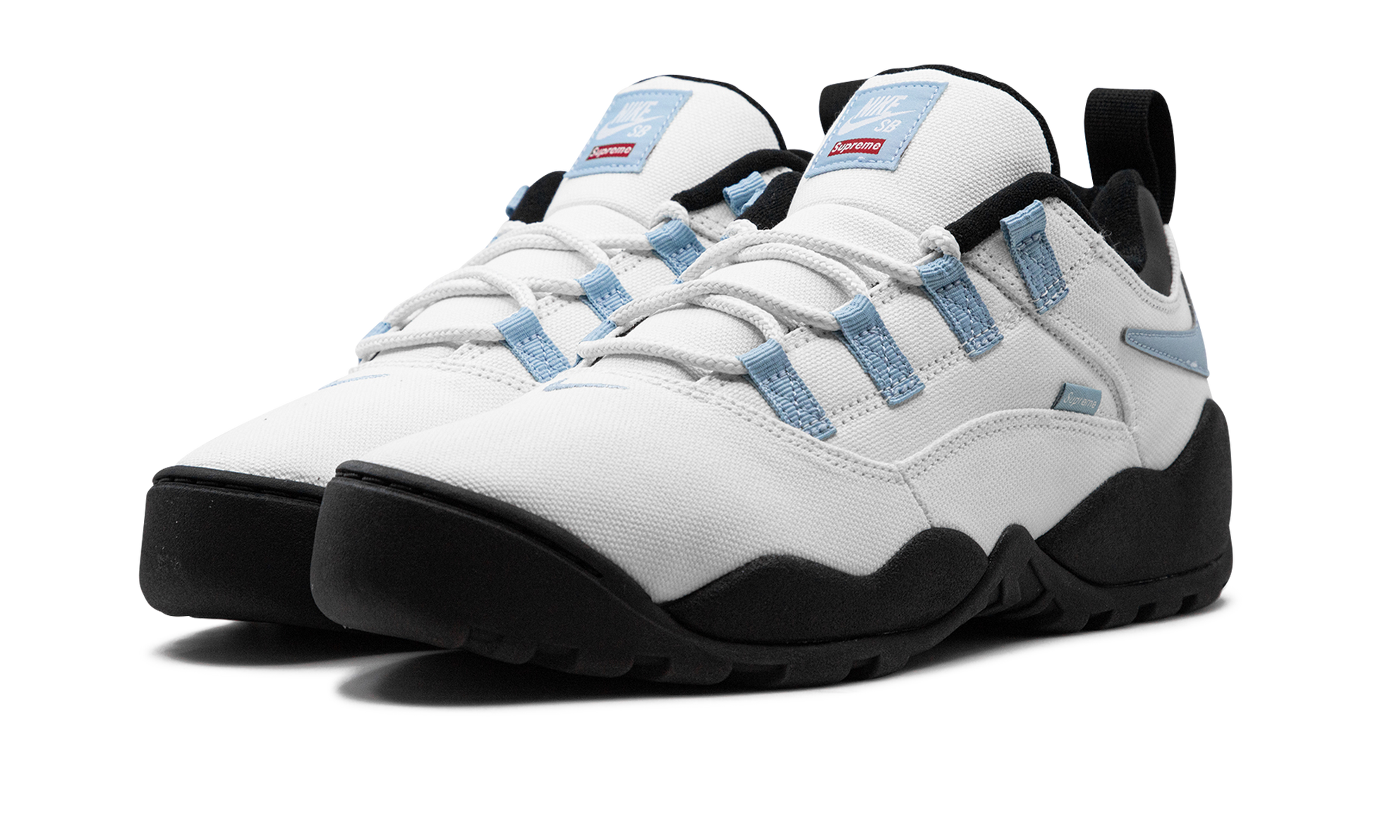 The Supreme x Nike SB Darwin Low "Sail" is a collaboration by the New York based streetwear brand on a versatile colorway of the retro sneaker. The Nike Darwin was designed by legendary Nike footwear designer Tinker Hatfield and worn by Dennis Rodman in the NBA. Supreme and Nike SB team up to bring back the classic 1990s-era shoe with skate-friendly updates. The “Sail” colorway features a Sail canvas construction with a reversed Swoosh on the collar in light blue. A small Swoosh appears on the toe and a “Supreme” branded tag is seen on the lateral side of the shoe. Dual “Supreme” and “Nike SB” detailing appears on the tongue tag. Supreme - Sail