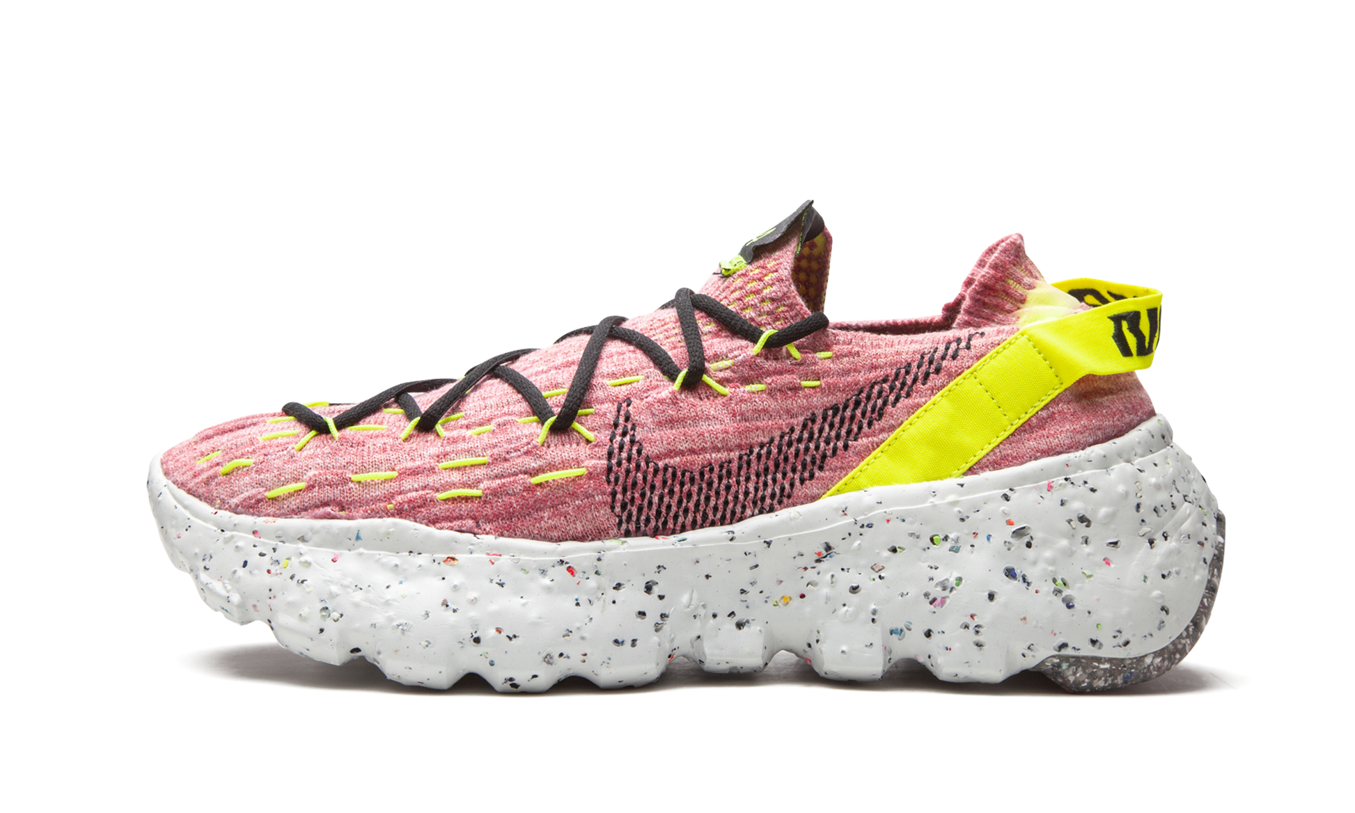 The Women’s Nike Space Hippie 04 “Lemon Venom” is a women’s exclusive colorway of the sustainable shoe from Nike’s “Space Hippie” campaign. The forward-thinking collection is centered around the idea of living on Mars with few resupply missions. Each model in Nike’s “Space Hippie” line is built from “space junk,” otherwise known as leftover materials from Nike’s cutting room floor. The recycled scraps form the pink and grey woven upper and speckled FoamX midsole. A black dotted Swoosh appears on the mid-panel and futuristic “Nike” text graces the Lemon Venom nylon heel tab. Despite its sock-like appearance, a traditional lacing system can be found on the top of the shoe and provides the wearer with even more stability. Nike rounds out the look of the Space Hippie 04 by placing “space junk” within the foam outsole. Release date: August 20, 2020. Lemon Venom