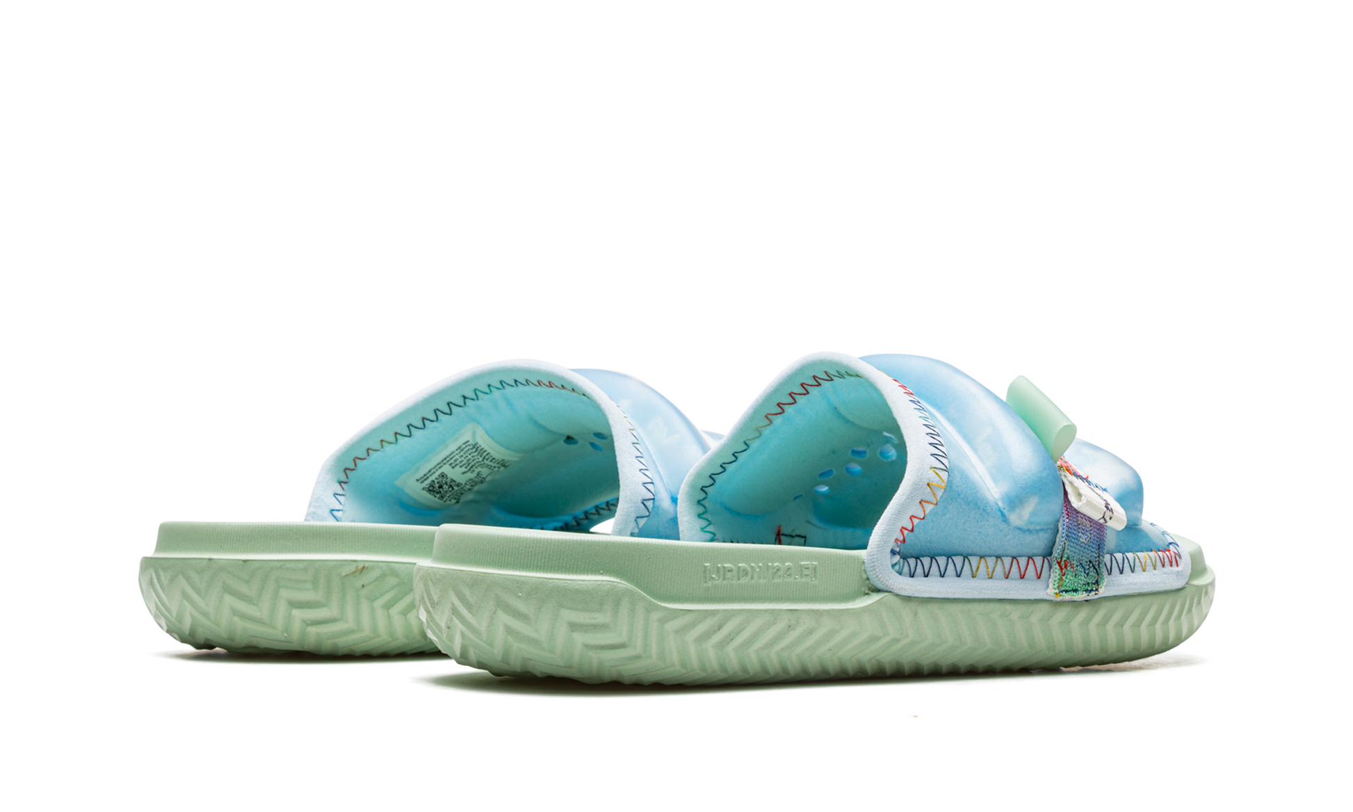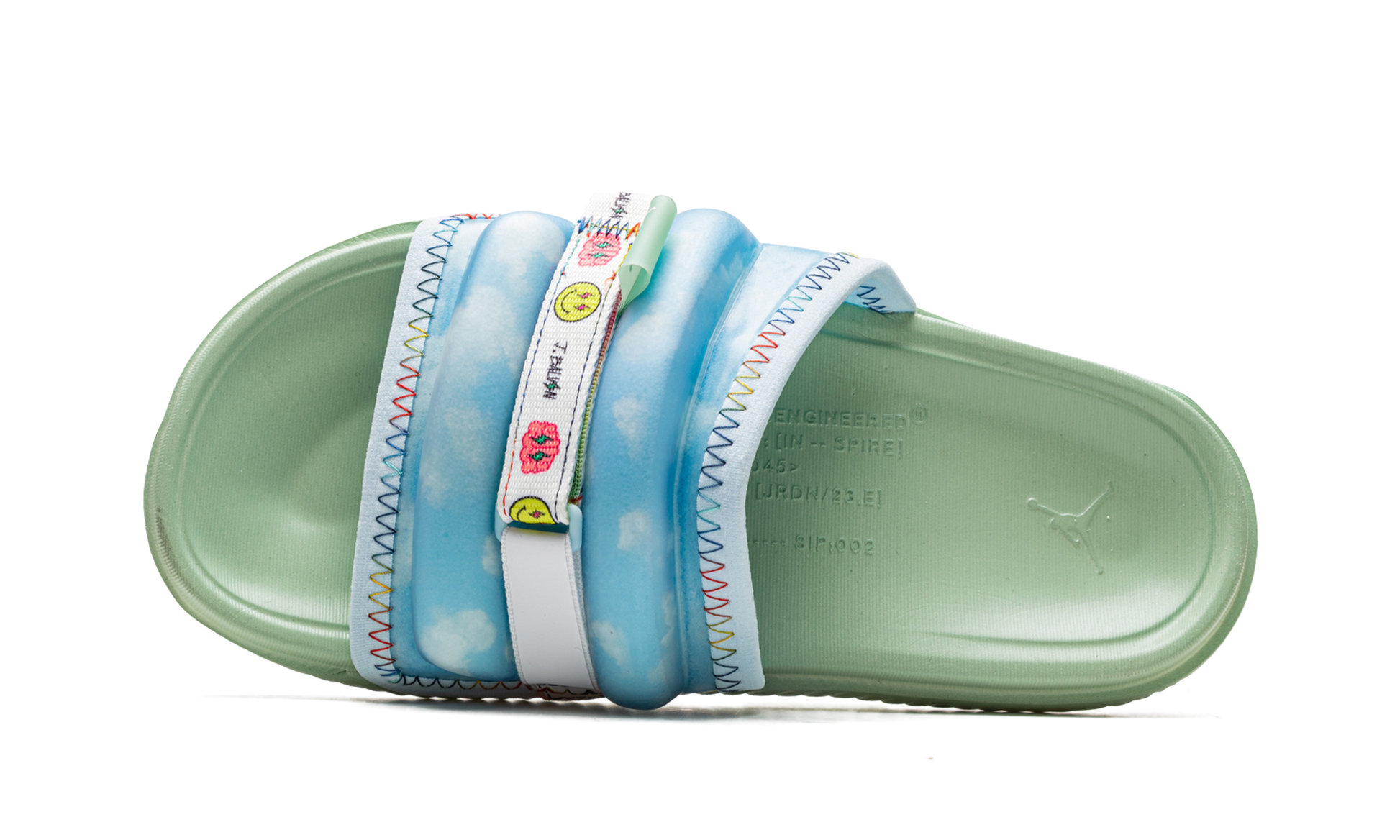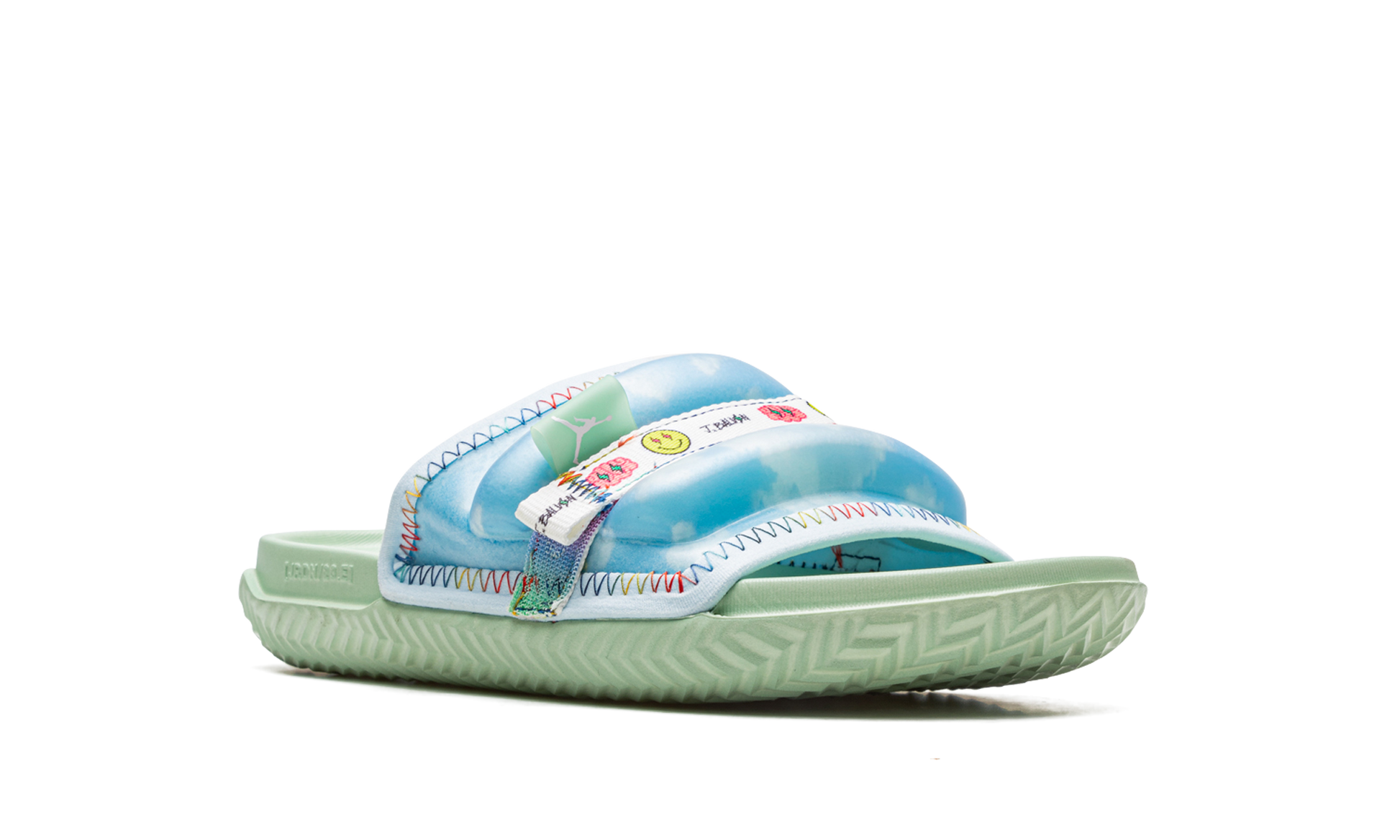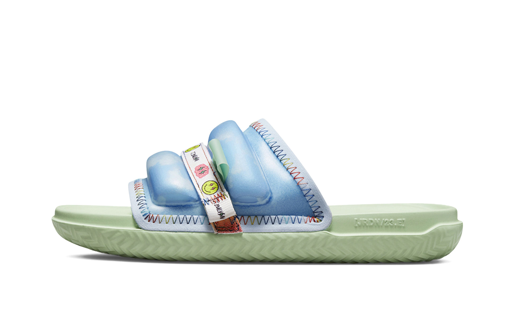 The J Balvin x Jordan Super Play Slide is a special collaboration between the Colombian musician and Jordan Brand on a casual slip-on sandal featuring the former’s bold design aesthetic. The colorway features a similar, cloud-like design as J Balvin’s Air Jordan 2 from 2022. A blue textile overlay on the midfoot arch displays J Balvin branding along with smiley face graphics. Contrasting rainbow zig-zag stitching borders the midfoot arch. The Seafoam Green midsole features glow-in-the-dark detailing. Release date: September 15, 2022 J Balvin