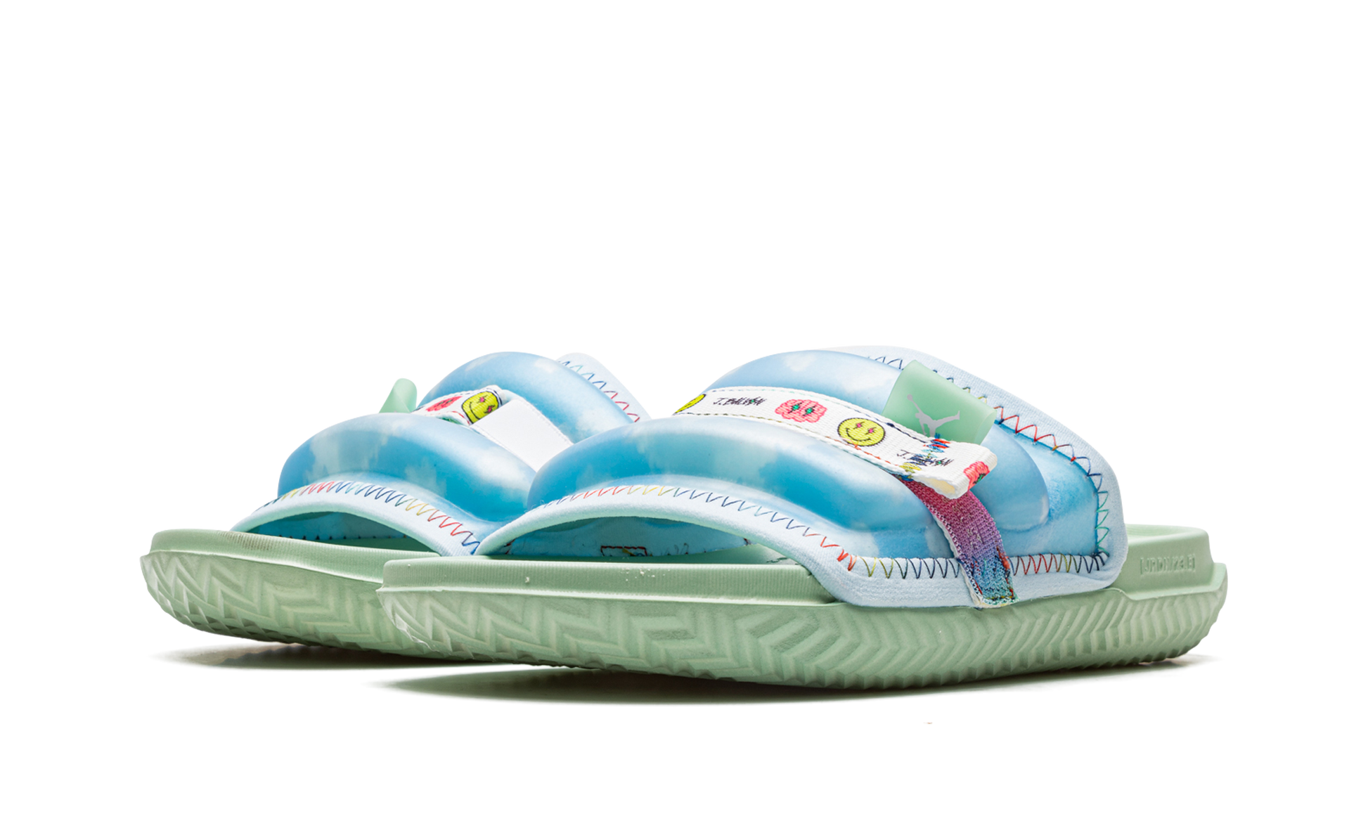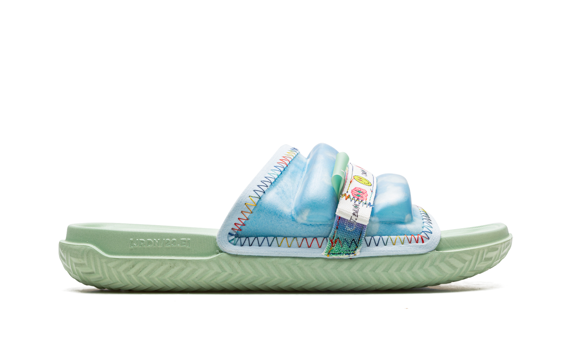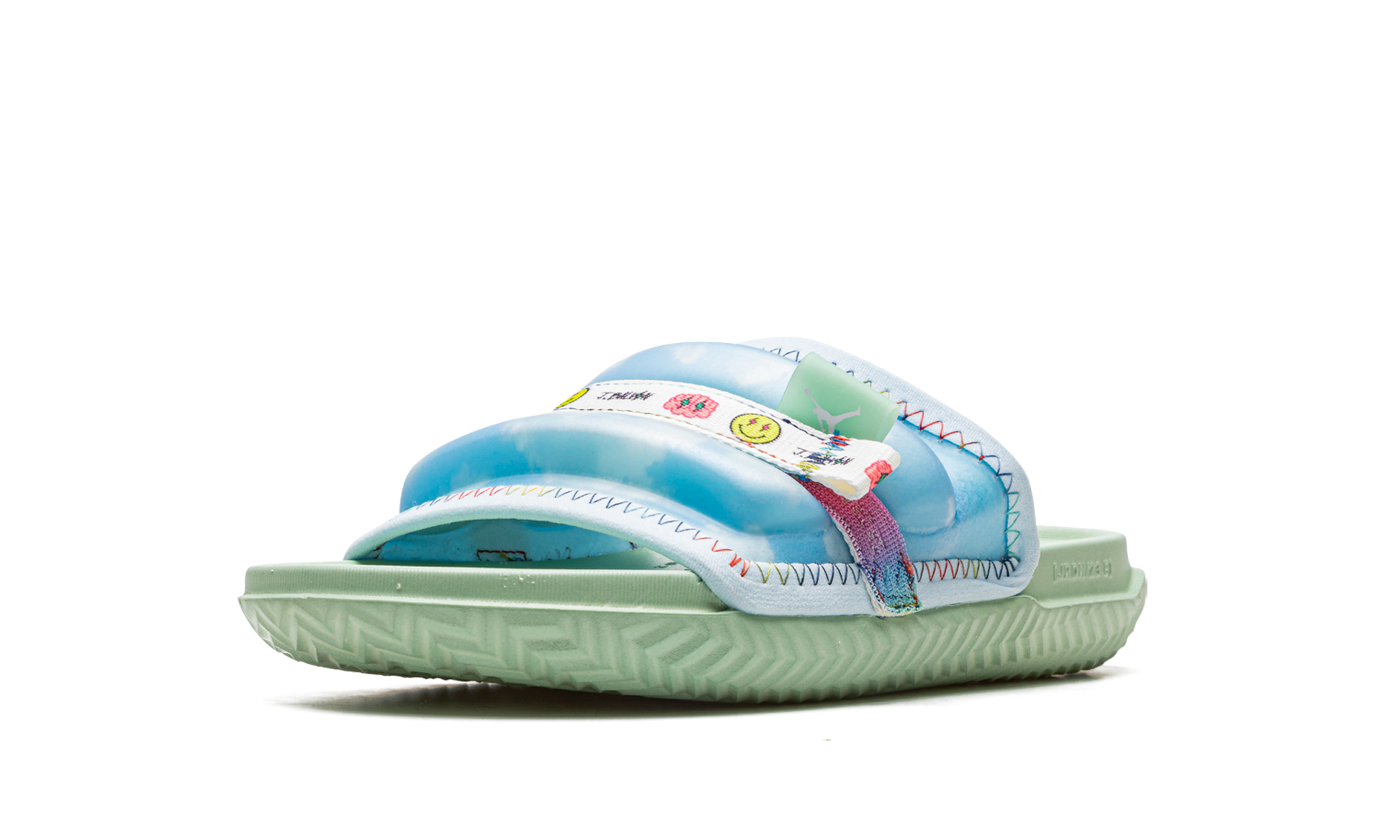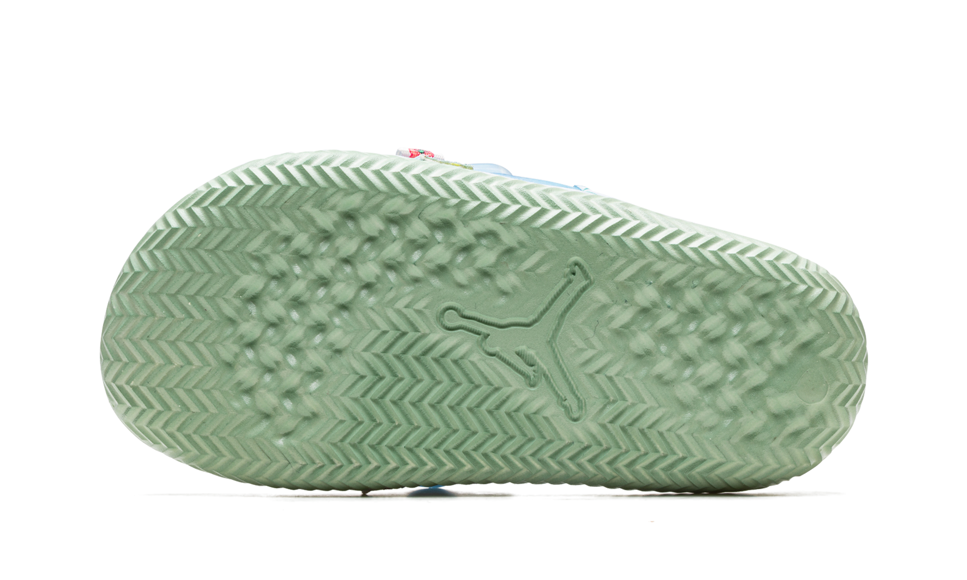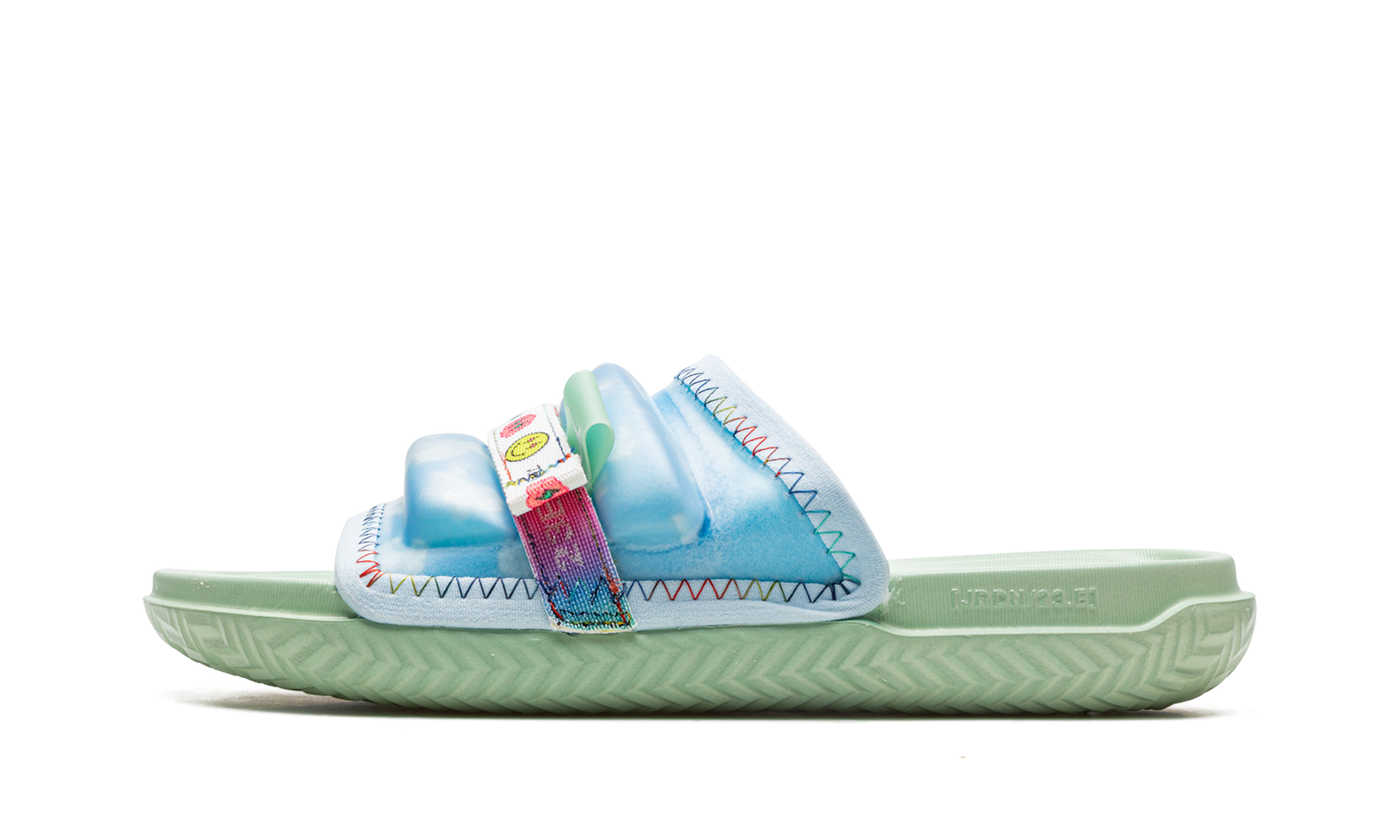 The J Balvin x Jordan Super Play Slide is a special collaboration between the Colombian musician and Jordan Brand on a casual slip-on sandal featuring the former’s bold design aesthetic. The colorway features a similar, cloud-like design as J Balvin’s Air Jordan 2 from 2022. A blue textile overlay on the midfoot arch displays J Balvin branding along with smiley face graphics. Contrasting rainbow zig-zag stitching borders the midfoot arch. The Seafoam Green midsole features glow-in-the-dark detailing. Release date: September 15, 2022 J Balvin