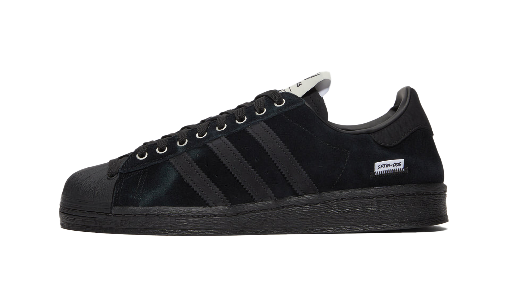 The Superstar 82 'Song For The Mute - Core Black' shoe blends classic Adidas Superstar style with a unique design inspired by the "Song For The Mute" collaboration, featuring a sleek core black aesthetic. Song for the Mute - Core Black