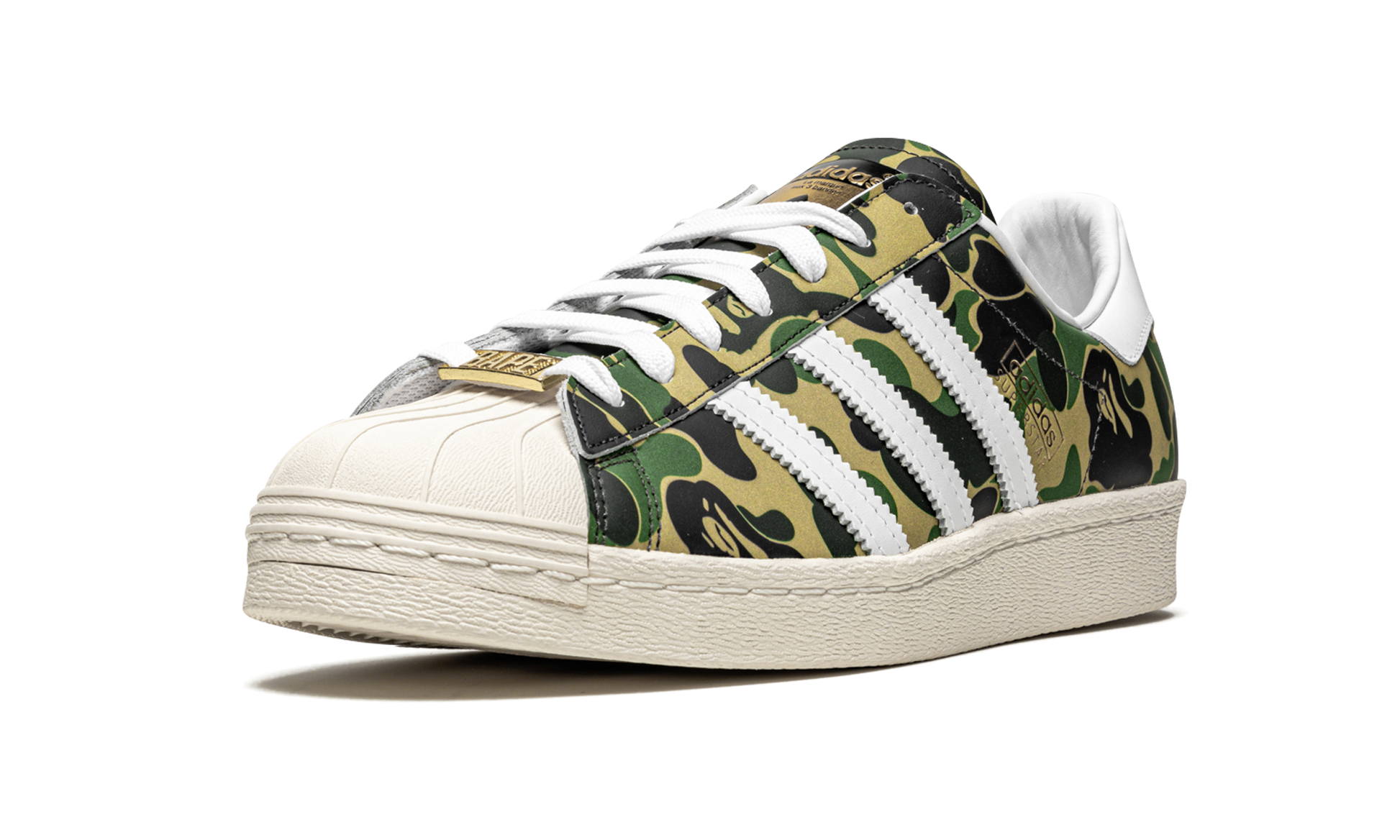 The Superstar 'BAPE - Green Camo' shoe features a classic Adidas Superstar style with a unique BAPE green camouflage print, offering a bold and distinctive look. BAPE - Green Camo