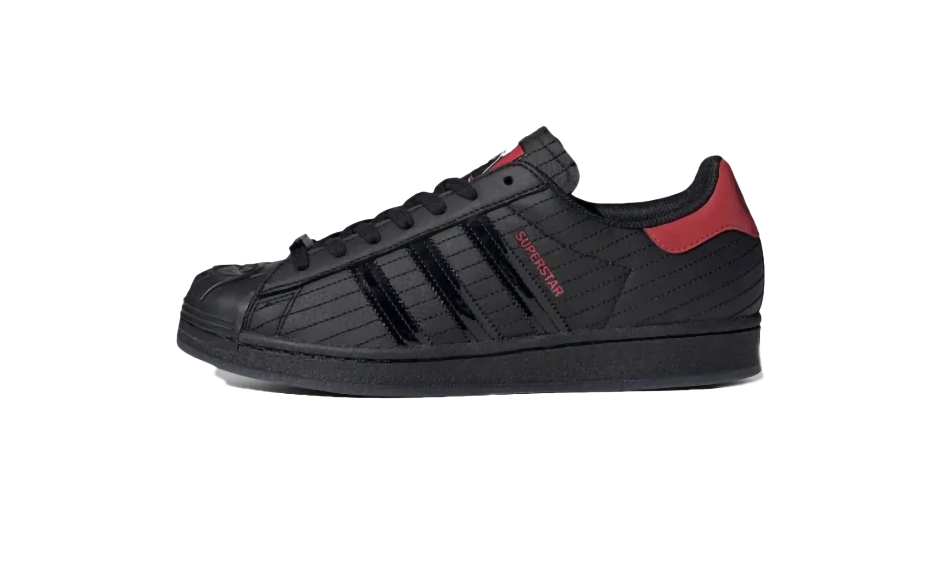 The Superstar 'Star Wars Darth Vader' shoe features a design inspired by the iconic villain, blending classic Adidas Superstar style with unique Star Wars details. Star Wars Darth Vader
