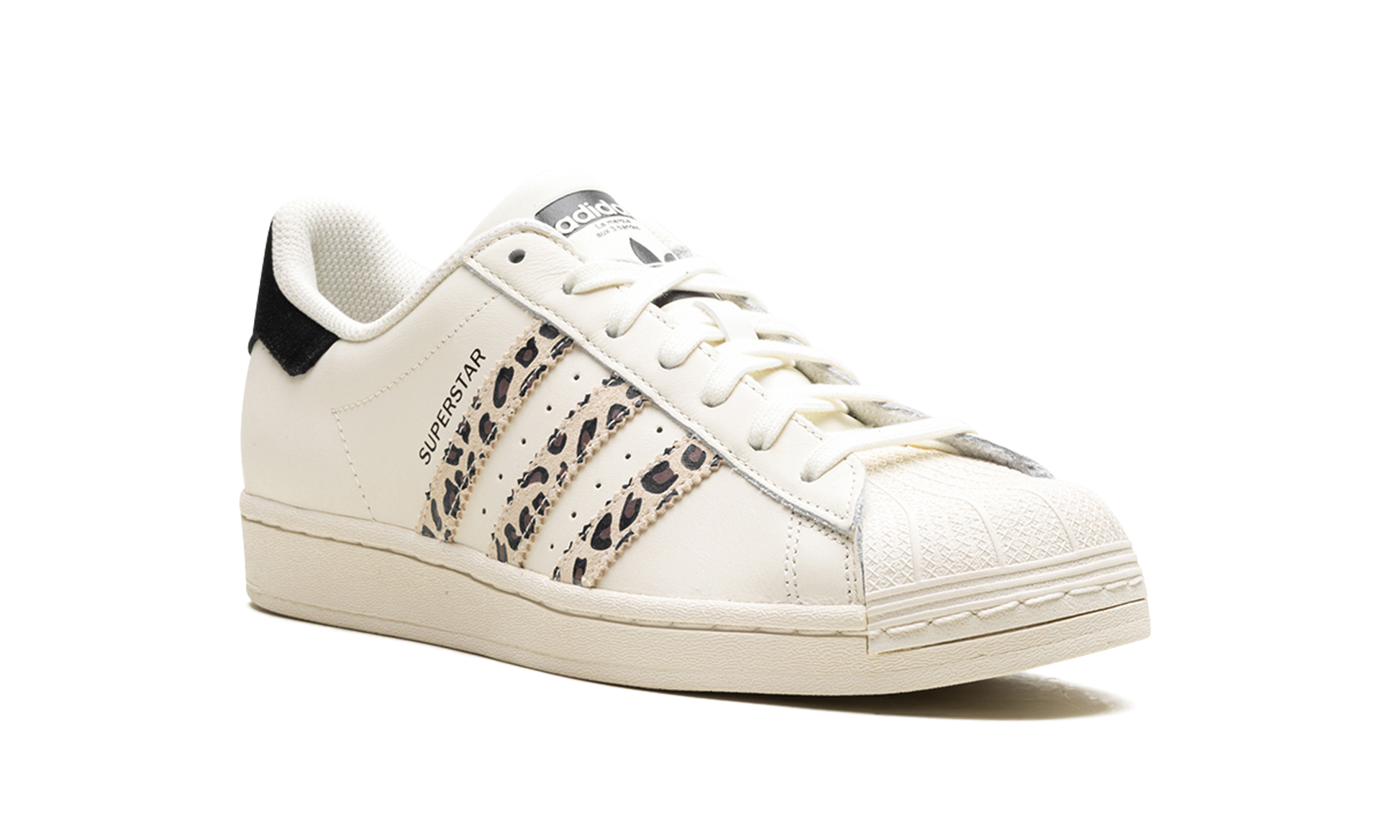 The Superstar WMNS 'Off White Black Leopard' shoe features a classic design with a bold leopard print, offering a versatile and stylish addition to any sneaker collection. Off White Black Leopard