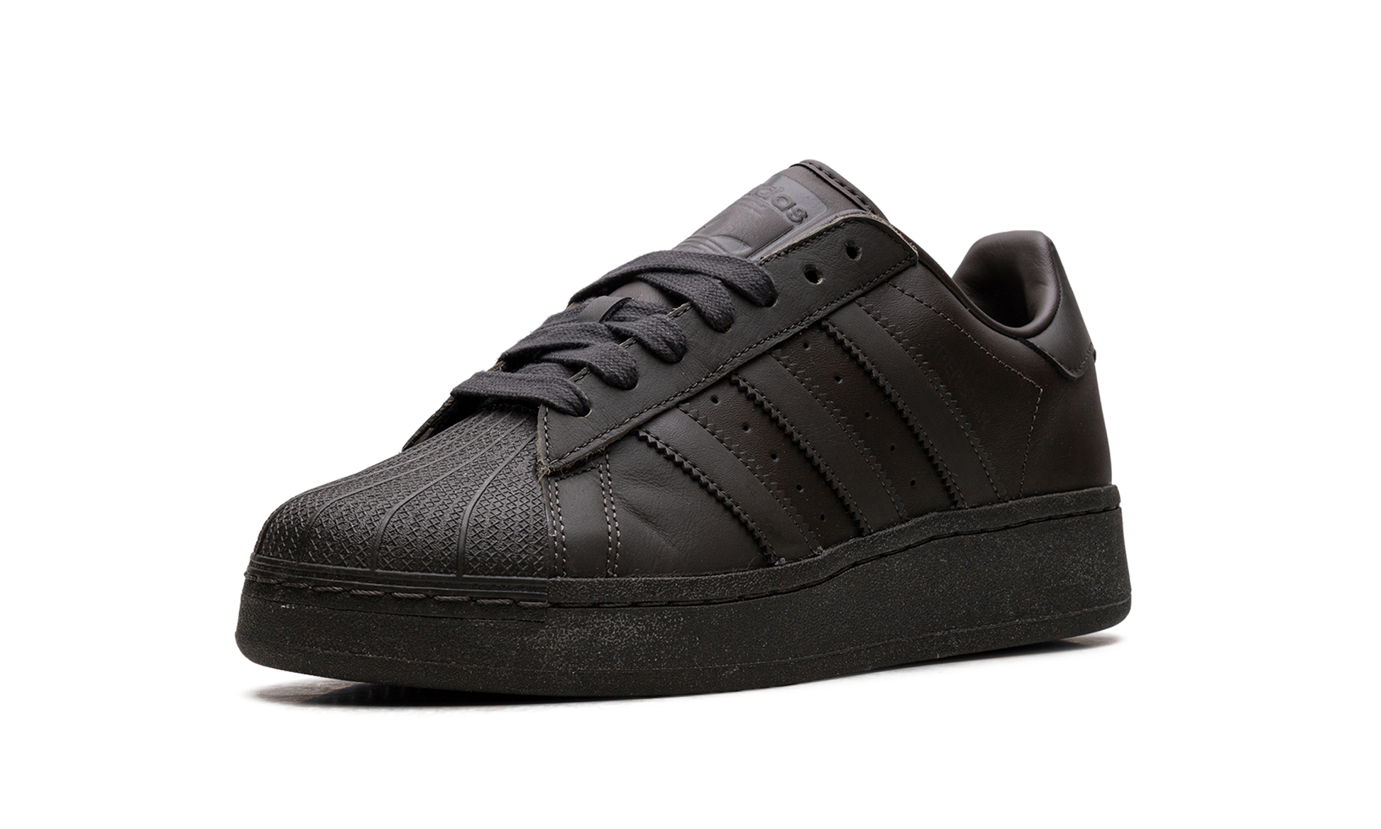 The Superstar XLG 'Black' shoe features an enlarged design with a sleek black colorway, offering a bold and fashionable take on the classic Superstar silhouette for a standout look. Black
