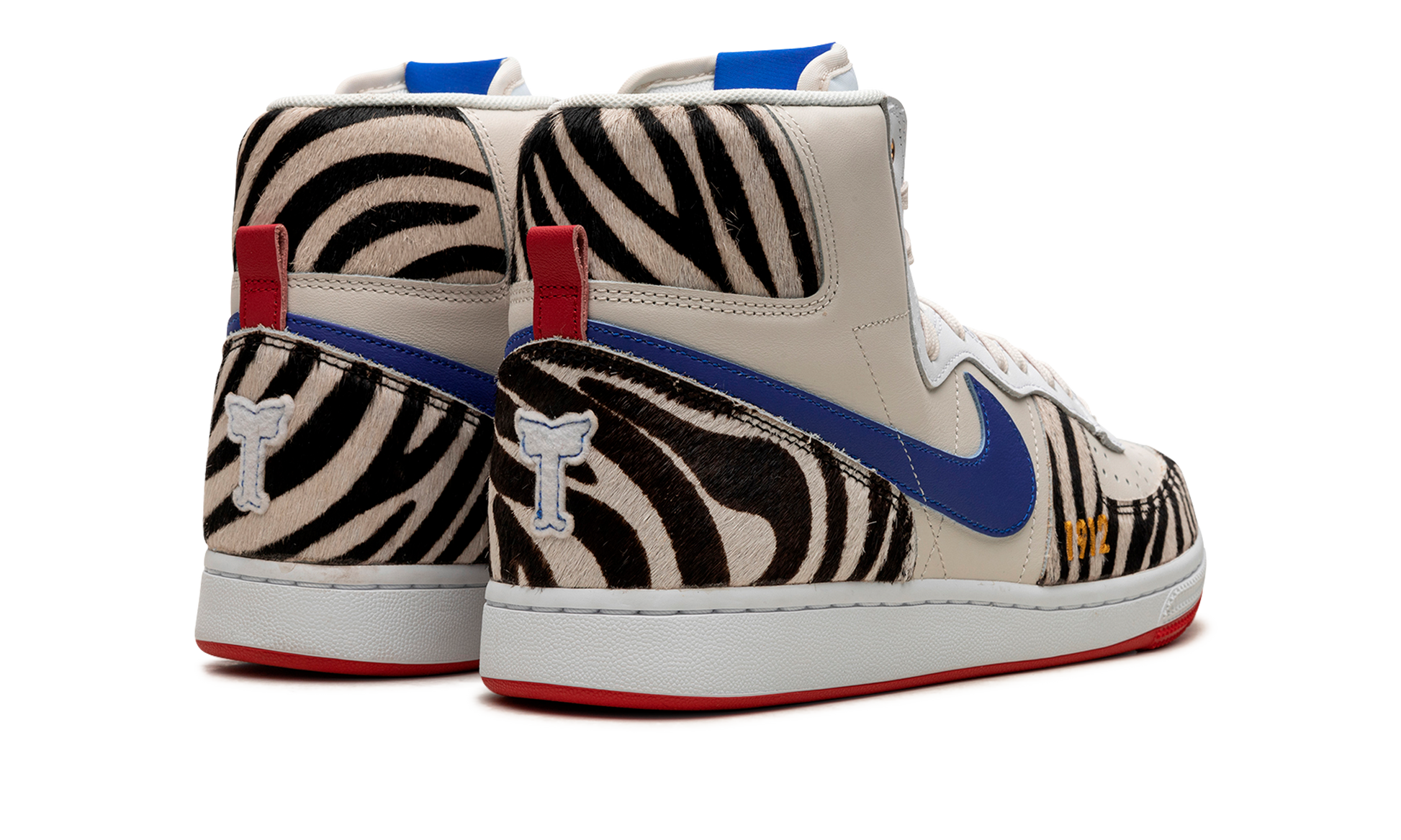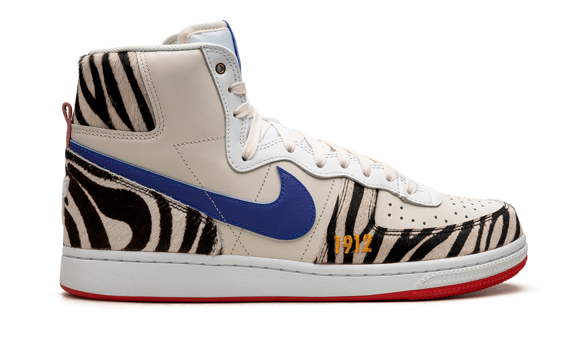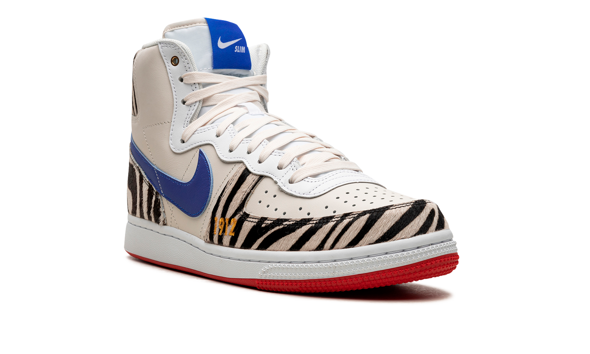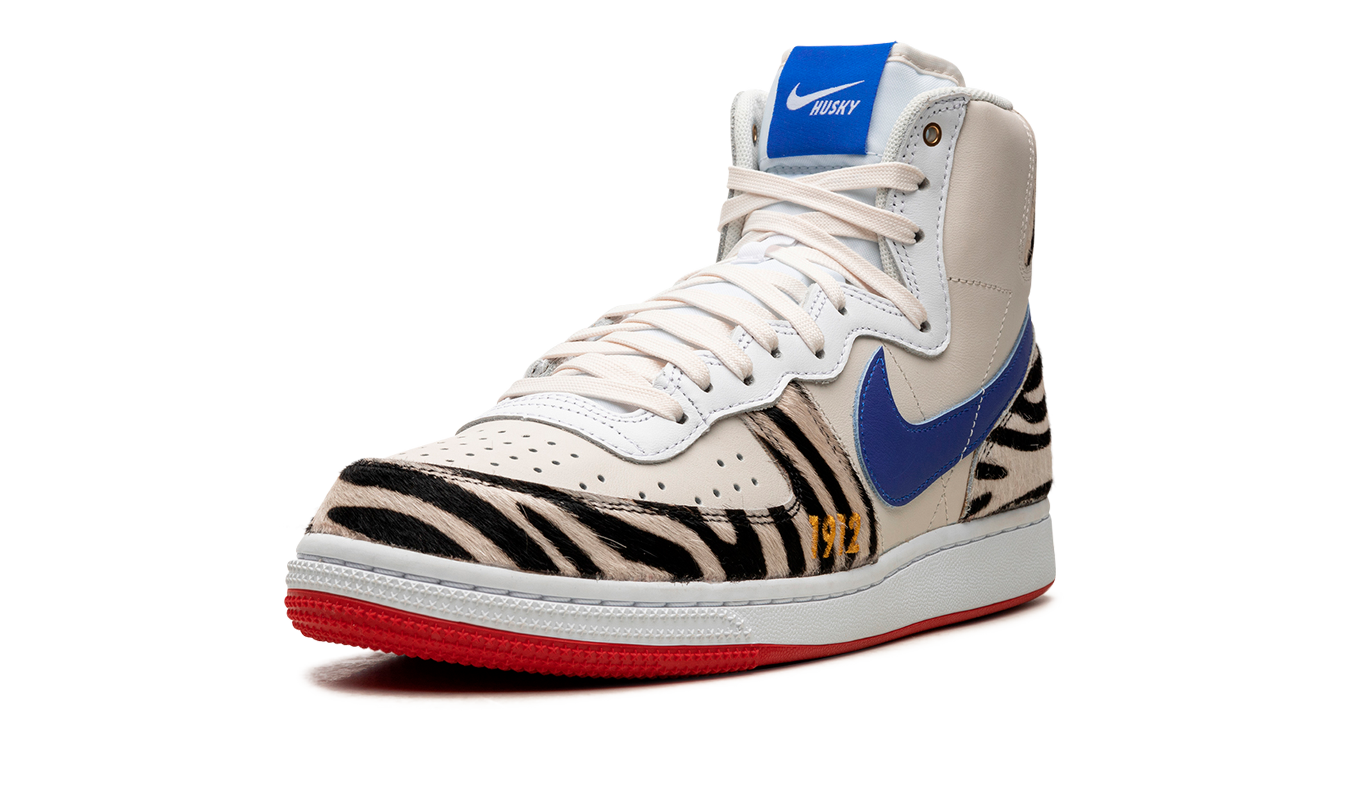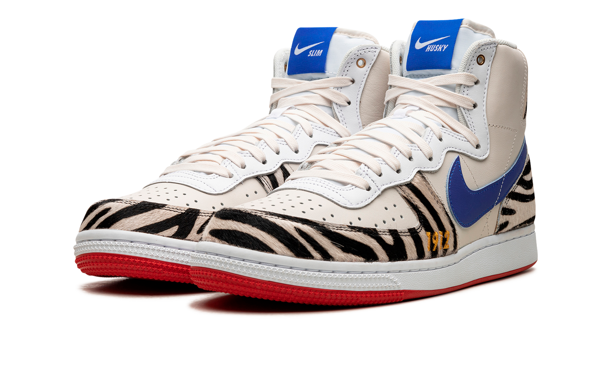 The Nike Terminator High "Slim & Husky's Pizza" is a colorway of the retro sneaker inspired by the Nashville, Tennessee based pizza chain founded by Tennessee State University graduates. From a collection of HBCU-theme sneakers by Nike, the Terminator High “Slim & Husky’s Pizza” has an undeniably unique look. The upper features a Phantom-colored leather base with eye-catching zebra print on the faux-pony hair overlays. Racer Blue leather Swoosh branding can be found on both sides of the shoe. A “1912” embroidered logo on the forefoot salutes TSU’s founding year while “Slim” and “Husky’s” detailing appear separately on the left and right tongue, respectively. Release date: November 4, 2023 Slim & Husky's Pizza